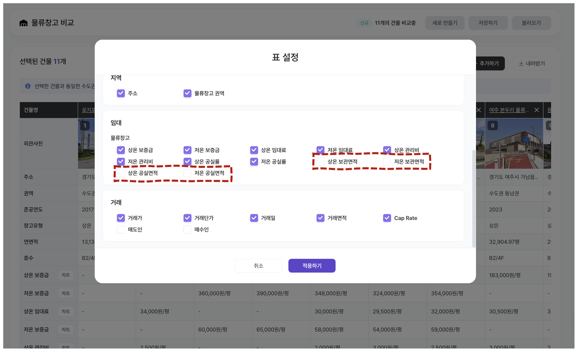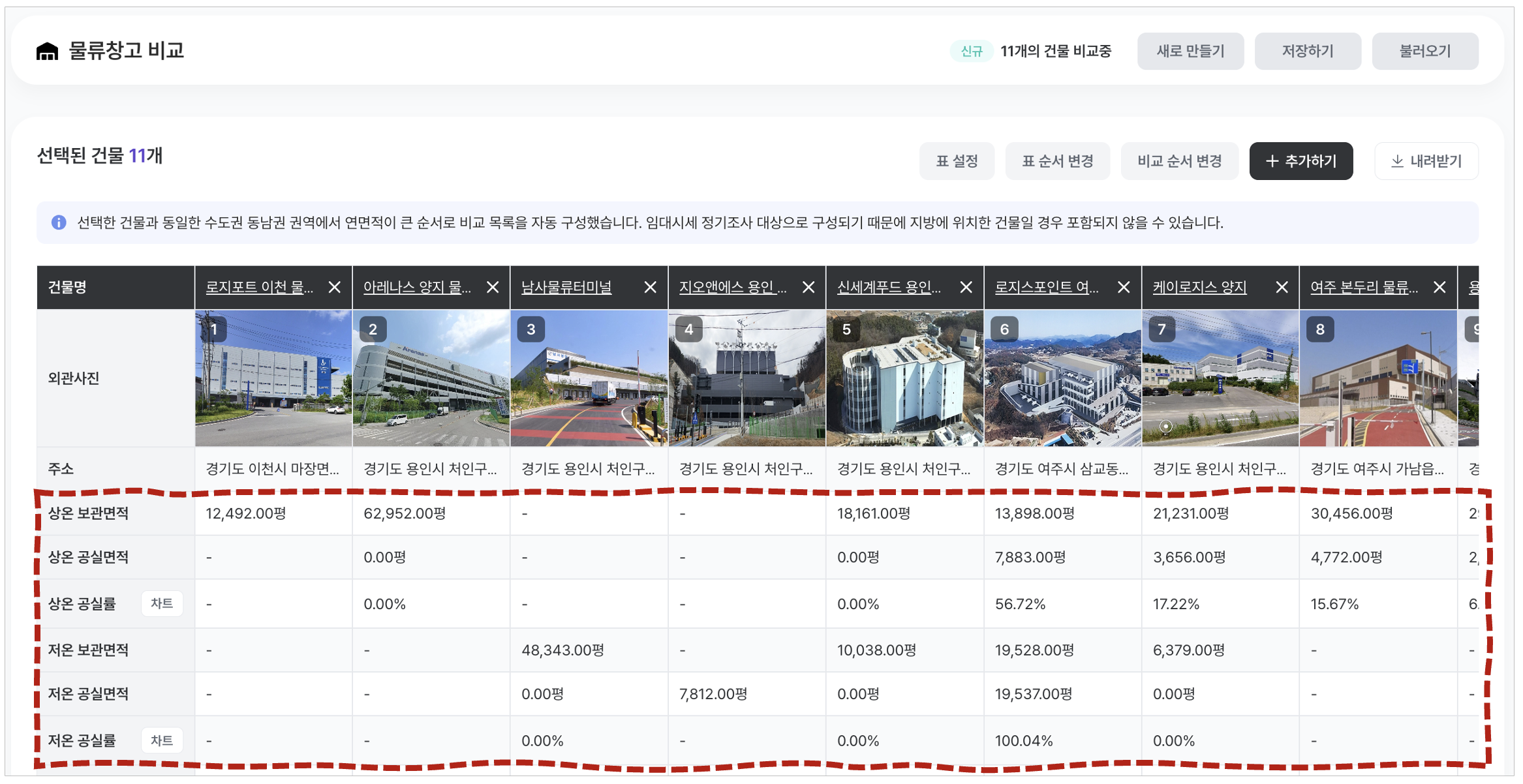 물류창고 비교 정보에 '보관면적(상온/저온)', '공실면적(상온/저온)' 항목을 추가했어요. 기존에는 '공실률(상온/저온)'만 제공됐는데, 공실률 계산에 활용되는 정보도 함께 활용할 수 있도록 했어요.
