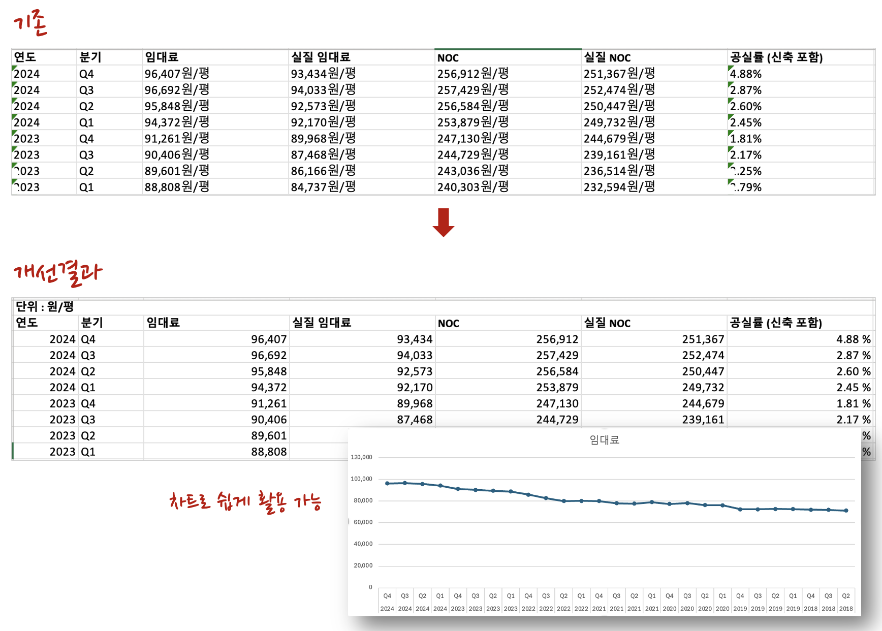 "값에 단위가 같이 표시(e.g. 96,407원/평)되어 있고, 셀 형식이 숫자가 아니라서, 피벗이나 차트로 활용하기 불편해요."