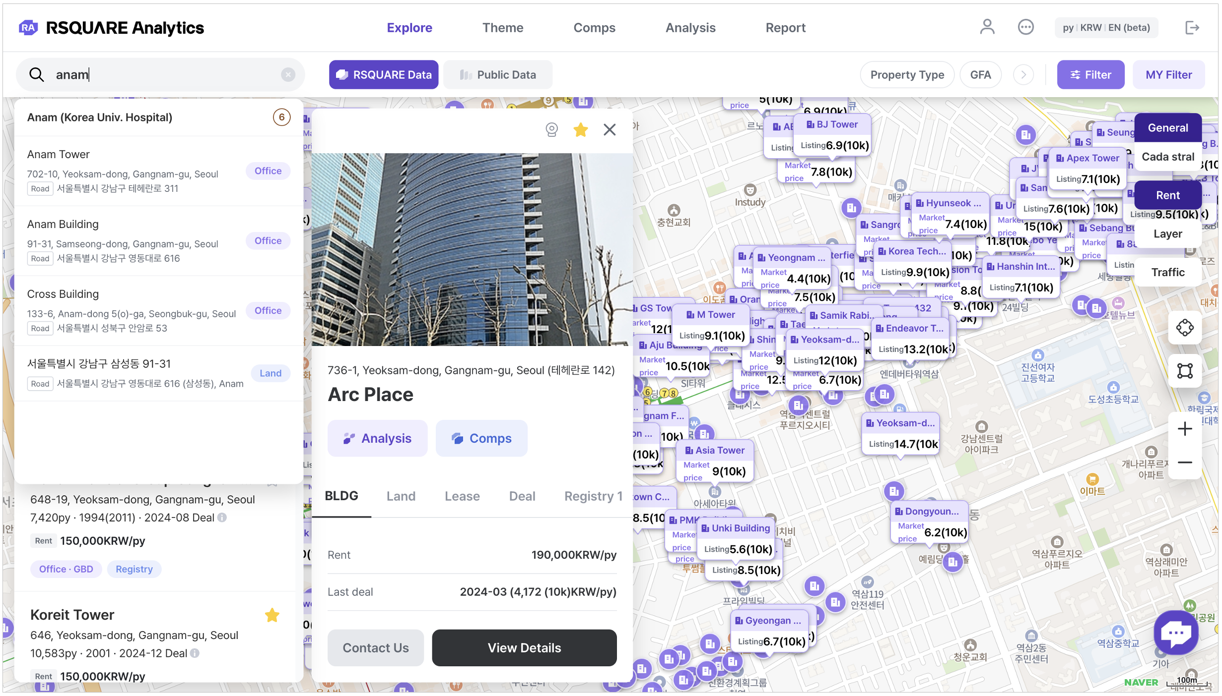 알스퀘어에서 수집한 오피스/근생 및 물류창고 임대매물(전국 지역, 최근 5년내) 총 5만여 개의 정보를 지도와 필터를 이용해 탐색하며 임대료, 매물면적, 매물수 동향을 분석할 수 있는데요.