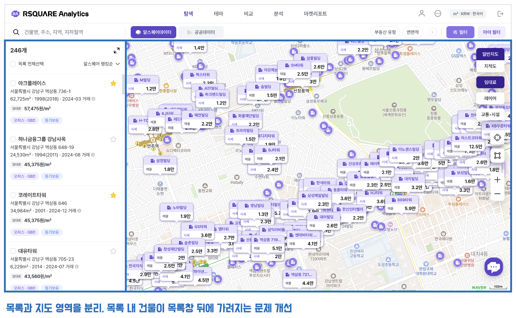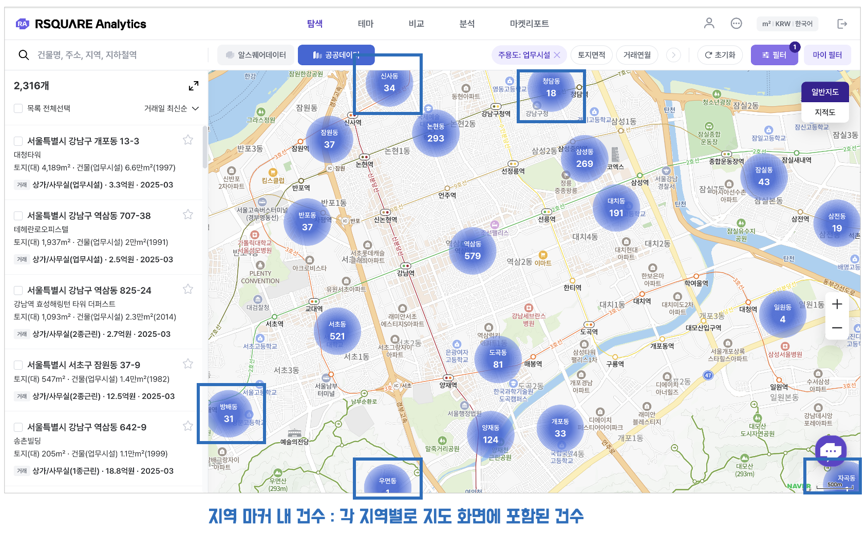 그런데 "지역 마커 상의 건수"와 "목록 건수"가 일치하지 않는 문제가 있었는데요. 이를 다음과 같이 수정했습니다.