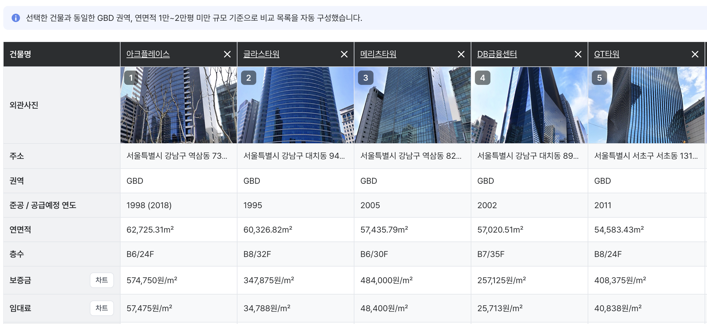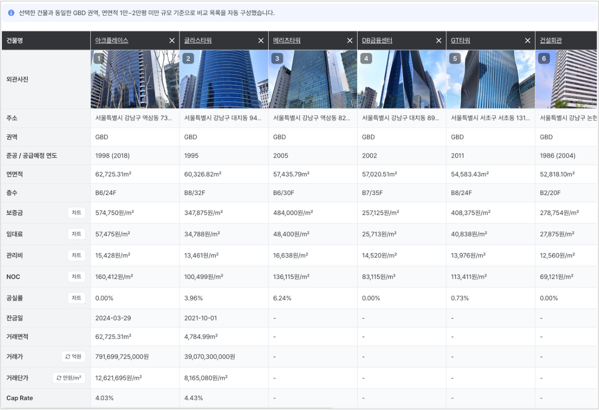 기존에는 건물 상세 화면에서 "비교" 실행 시, 유사건물(동일 권역 & 동일 연면적 규모)이 비교 대상으로 기본 제공되었어요.