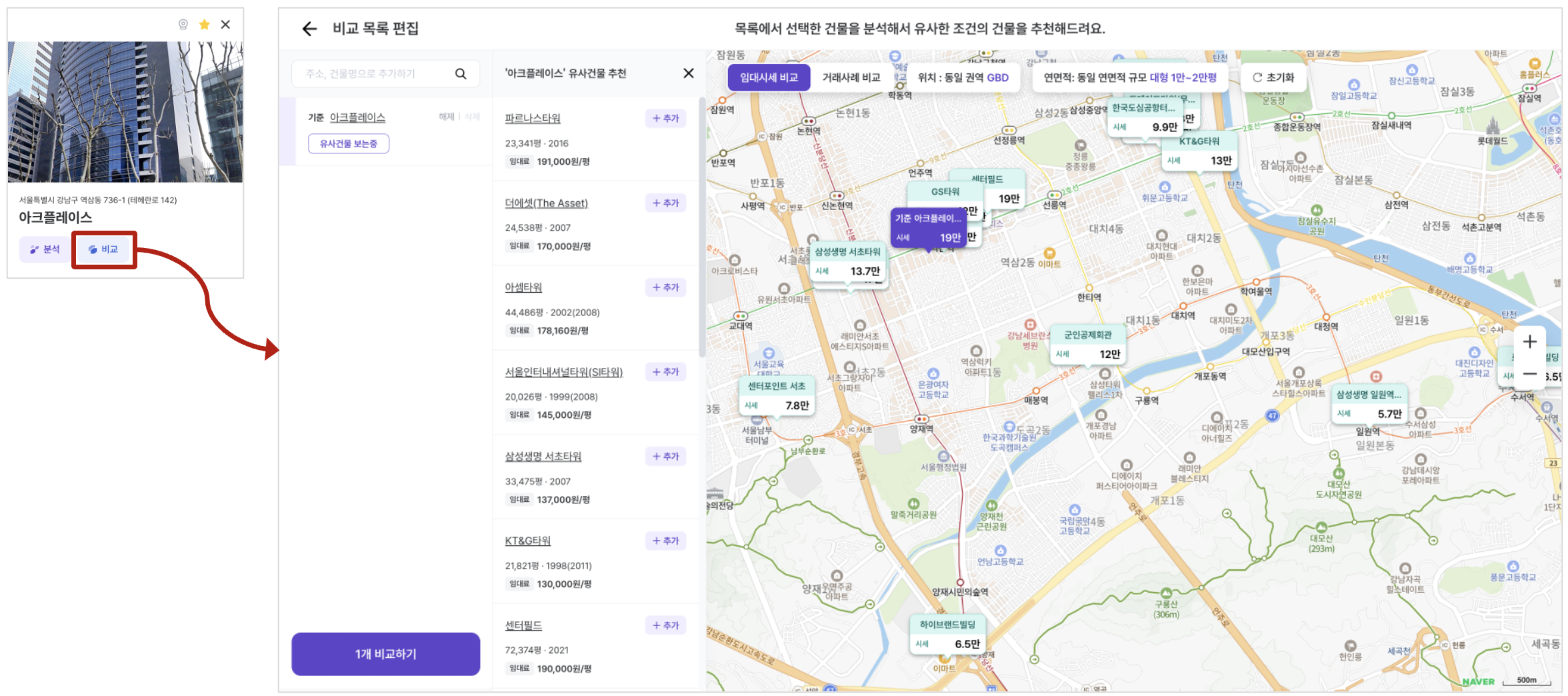 목록이나 마커에서 "+ 추가" 버튼을 클릭하여 비교 대상을 추가할 수 있어요.