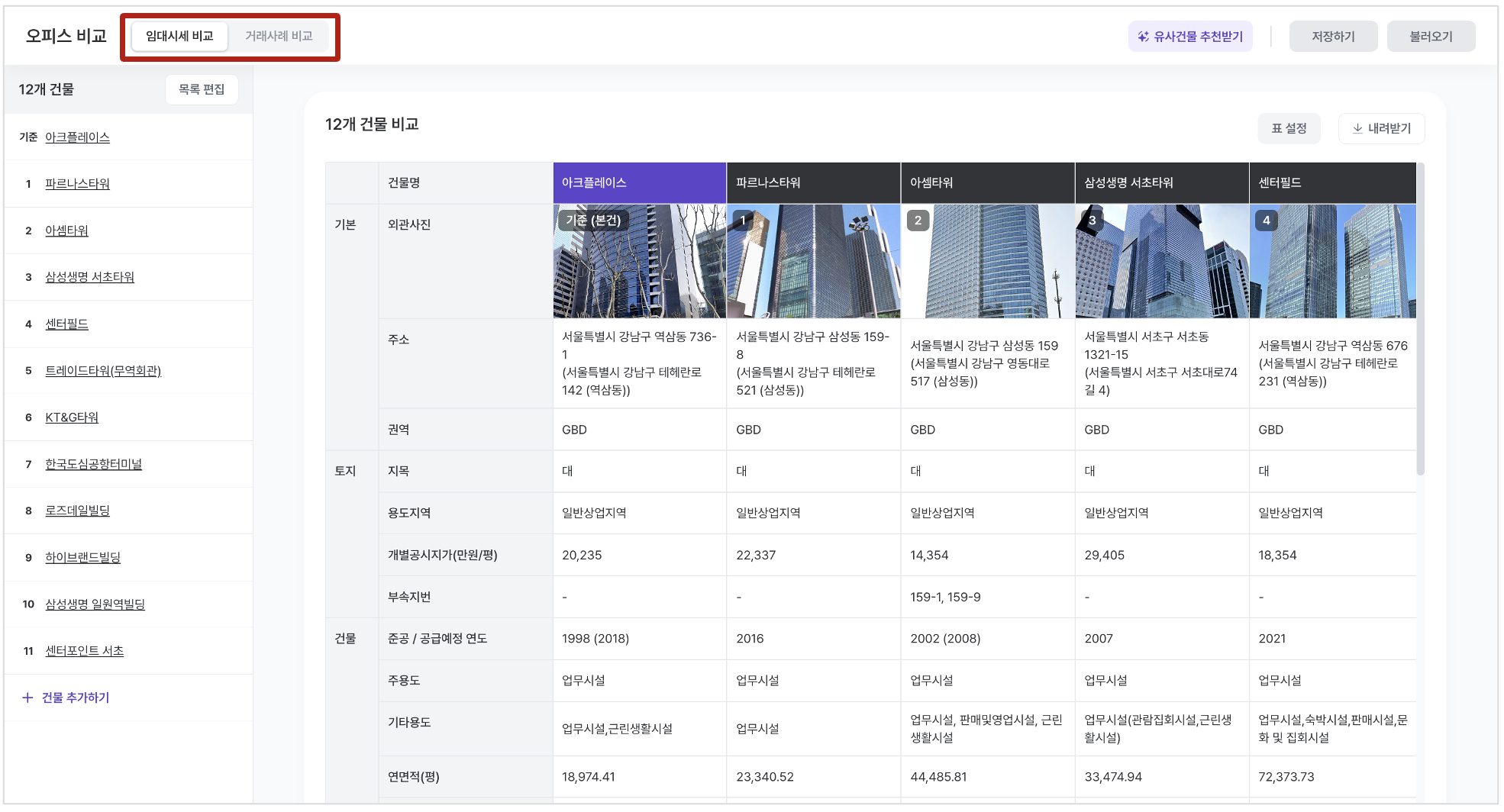 기존에는 유사건물 조건이나 비교 결과가 임대시세 정보 위주로만 제공되었어요.