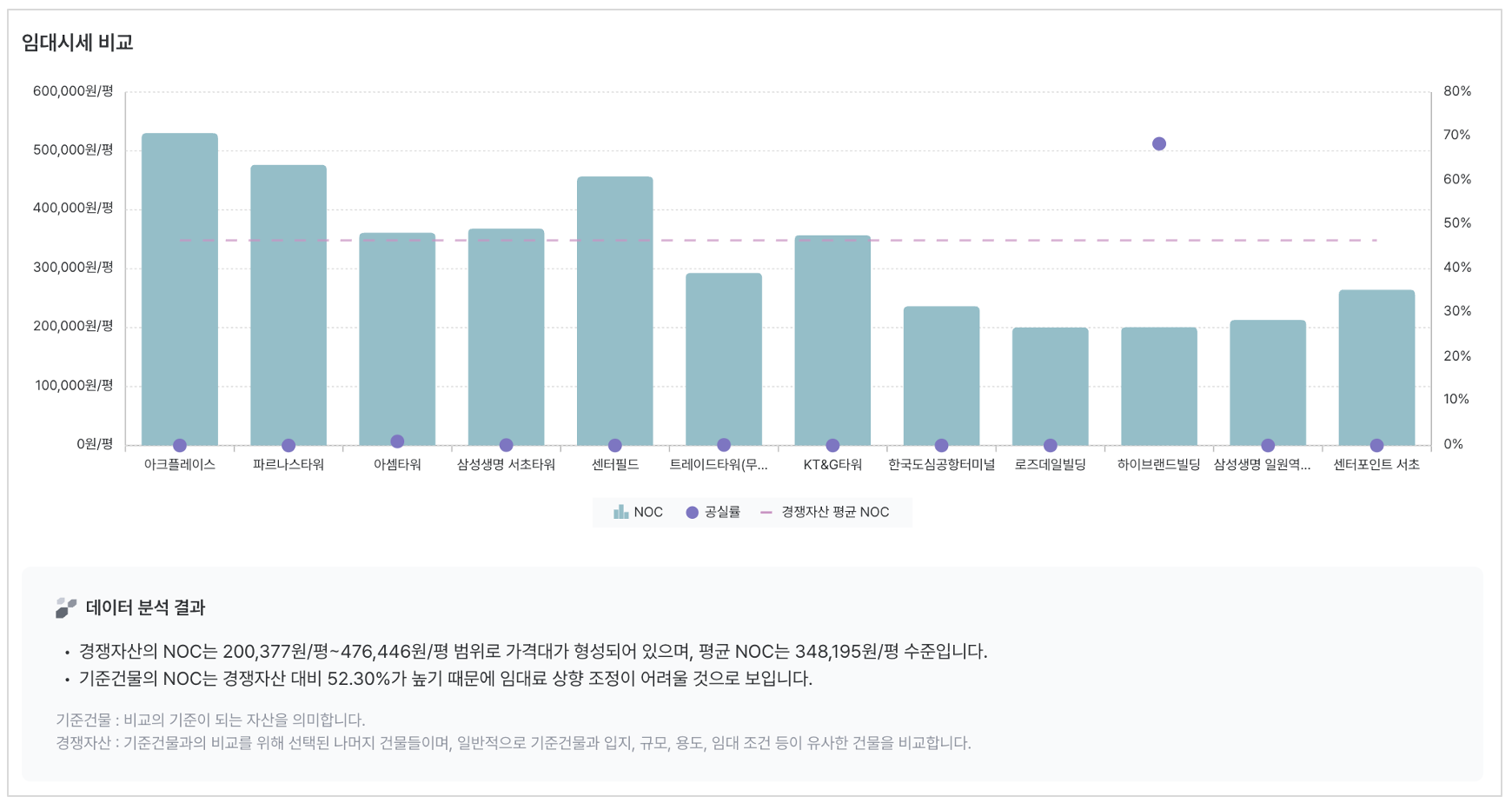 임대시세 비교 차트 : 기준건물과 경쟁자산의 임대시세 수준을 시각적으로 비교