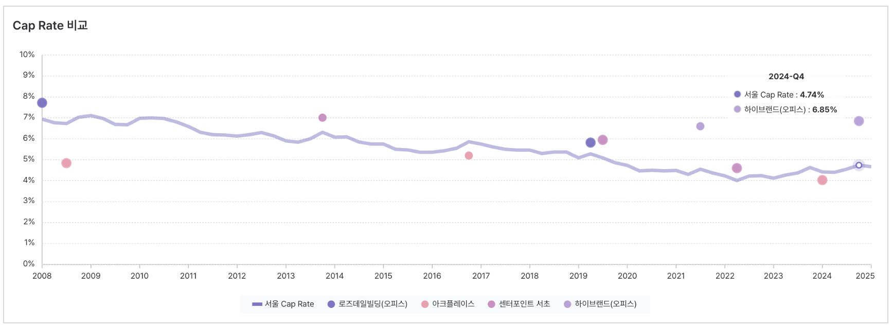 Cap Rate 비교 차트 : 서울 Cap Rate와 개별 건물들의 Cap Rate 수준 비교
