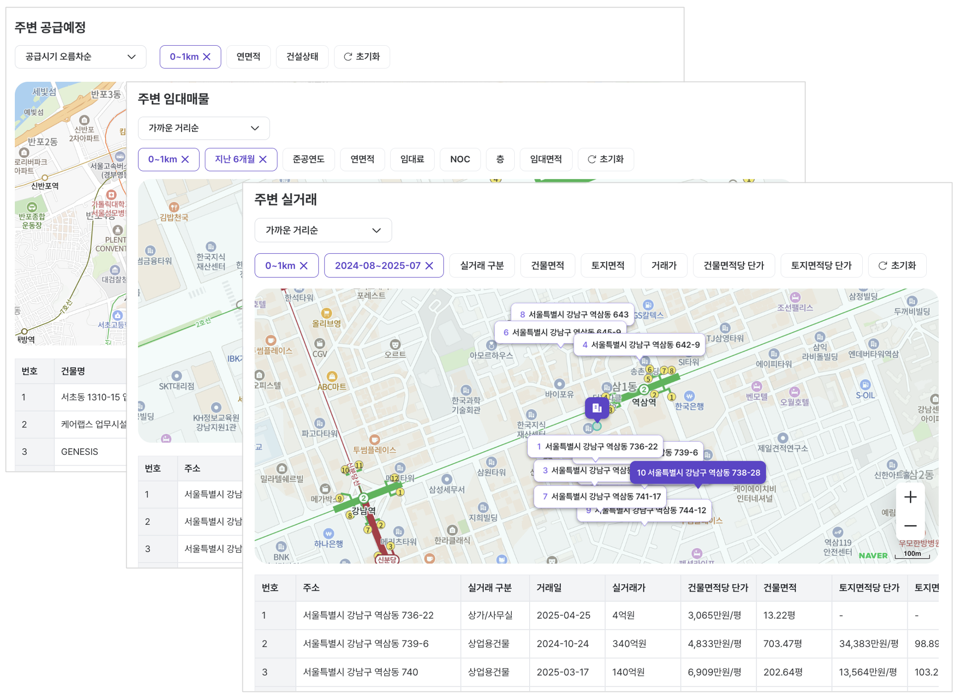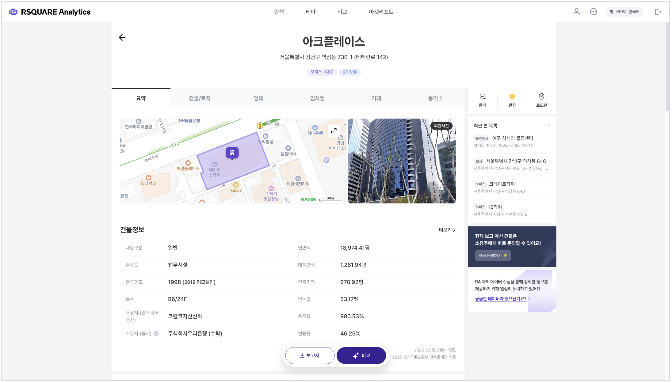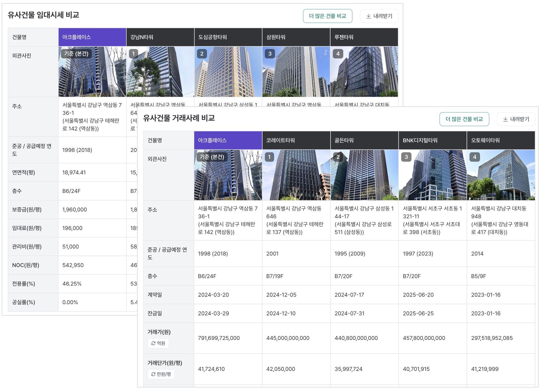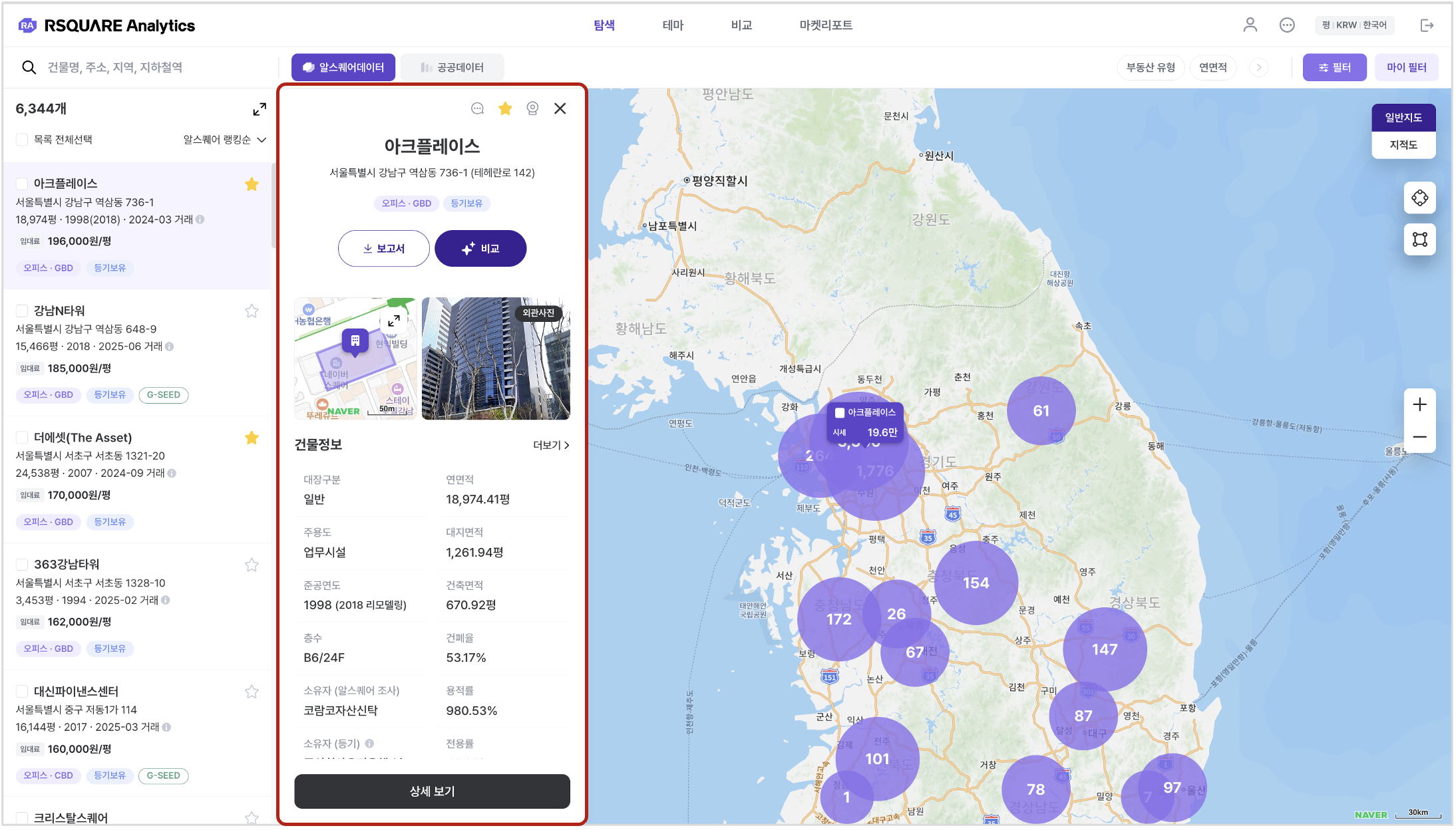 [자산분석] 화면에서 제공되던 분석 정보를 [상세] 화면에서 제공하게 됐어요. 기존 [상세] 화면에서는 해당 자산의 상세 정보만 제공됐는데, 주변 분석 및 경쟁자산 분석 정보도 바로 확인할 수 있어요.