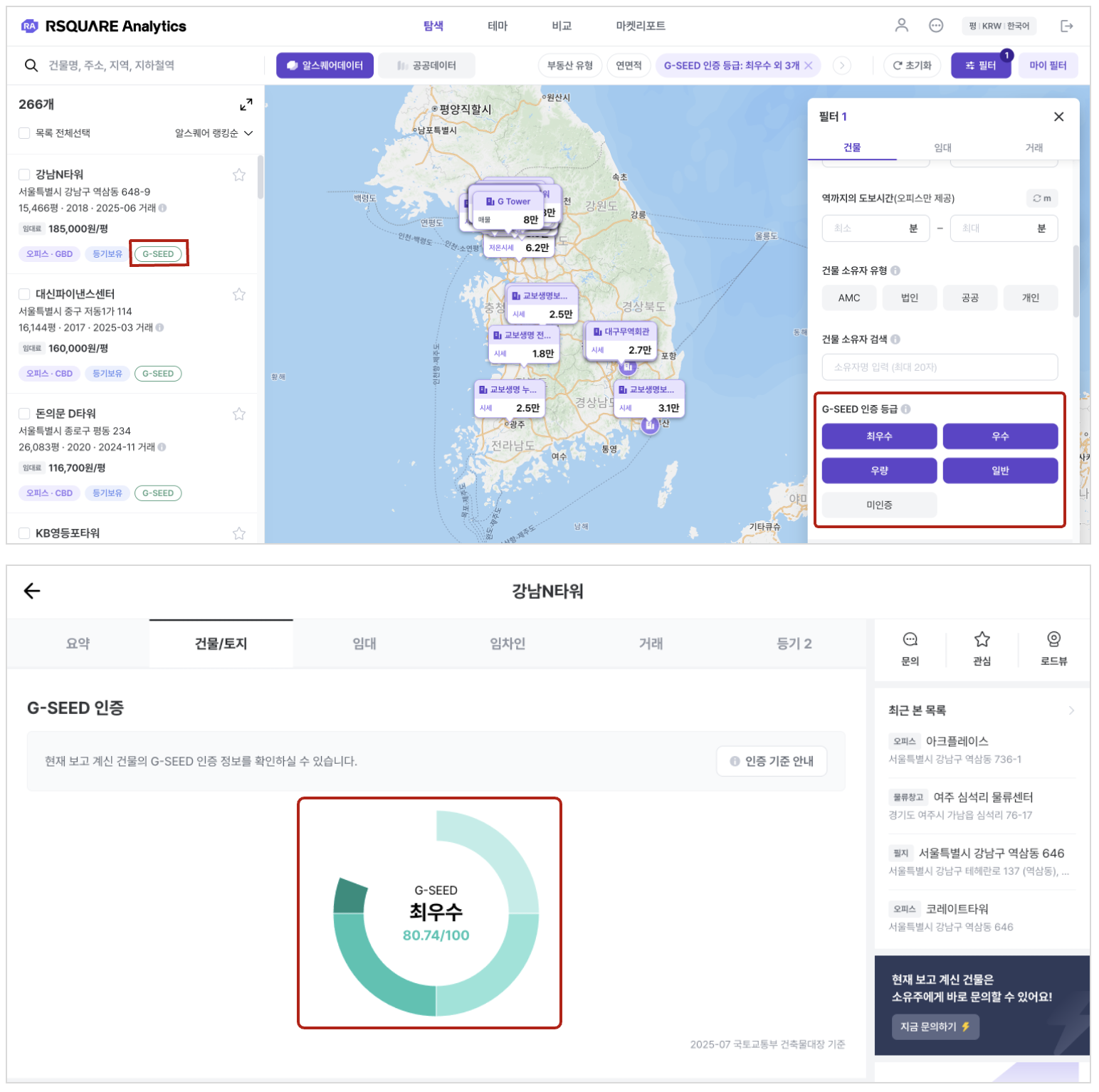 G-SEED는 대한민국 국토교통부가 2002년 도입한 국가 친환경 건축물 인증 제도에요. 해당 인증 정보가 건축물대장에 등록되어 있는데, 이를 필터로 탐색하고 상세 정보를 확인할 수 있어요.