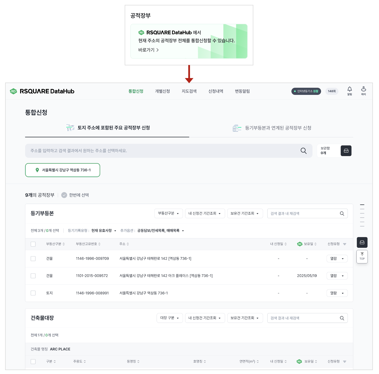 해당 건물 주소에 관한 부동산 공적장부 6종(부동산등기, 건축물대장, 토지대장, 토지이용계획, 지적도, 배치도)을 한 번에 검색/신청할 수 있어요.