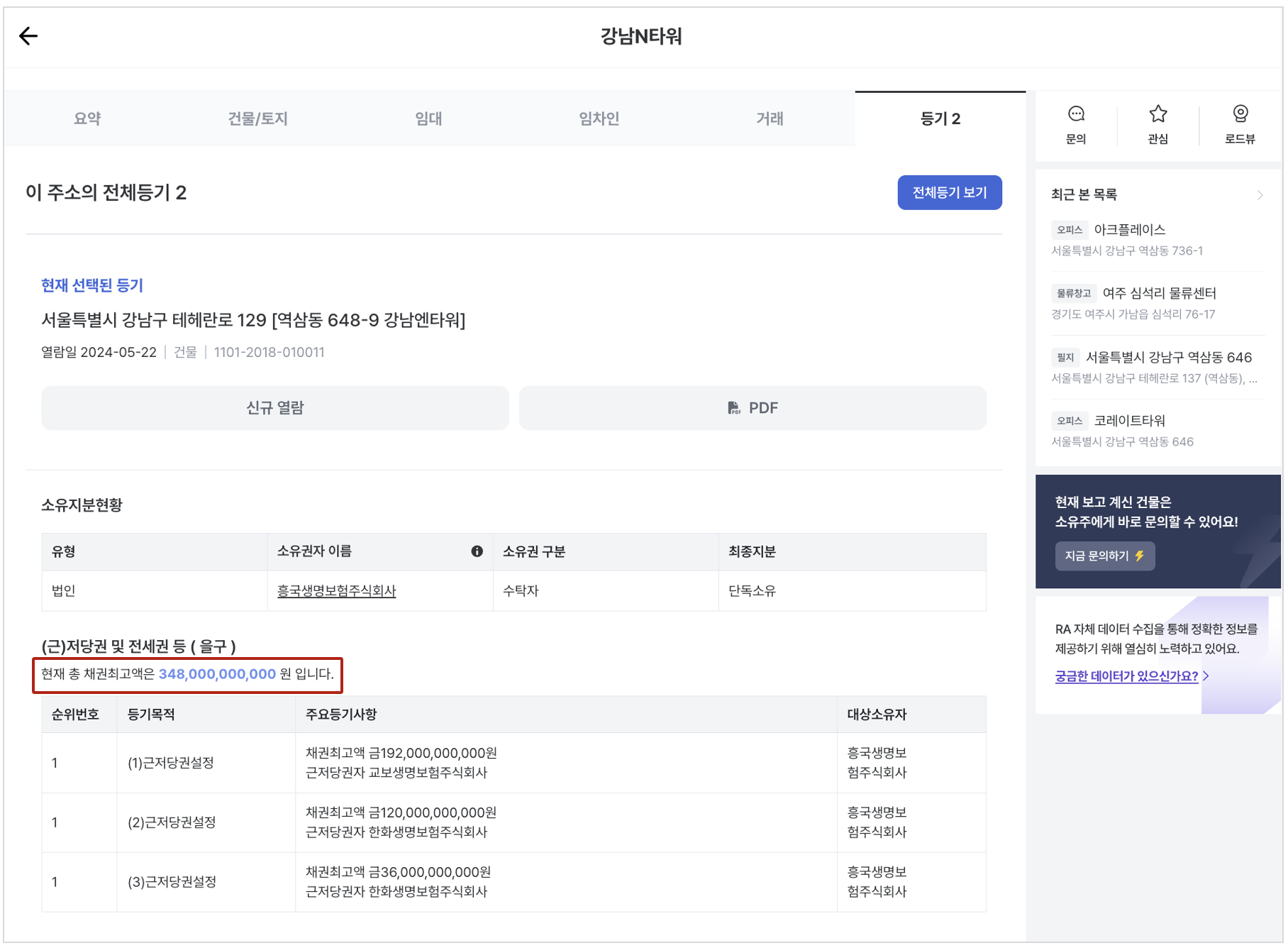 기 열람된 부동산등기의 근저당권 정보를 토대로 총 채권최고액 정보를 제공해요. 이를 통해 부동산 부채 수준을 가늠해 볼 수 있어요.