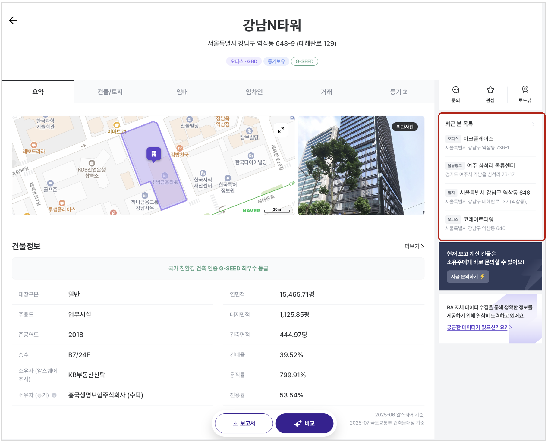 목록이나 마커를 선택하면 [상세 요약] 화면이 바로 제공되는데요. 건물의 주요/최신 정보 위주로 [상세 요약] 화면을 간소화하여 쉽고 빠르게 확인할 수 있도록 개선했어요.