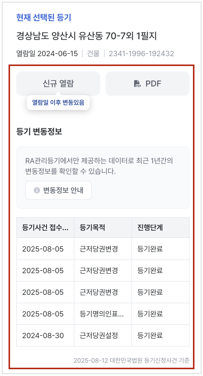 열람일 이후에 등기 변동사항 존재여부를 안내