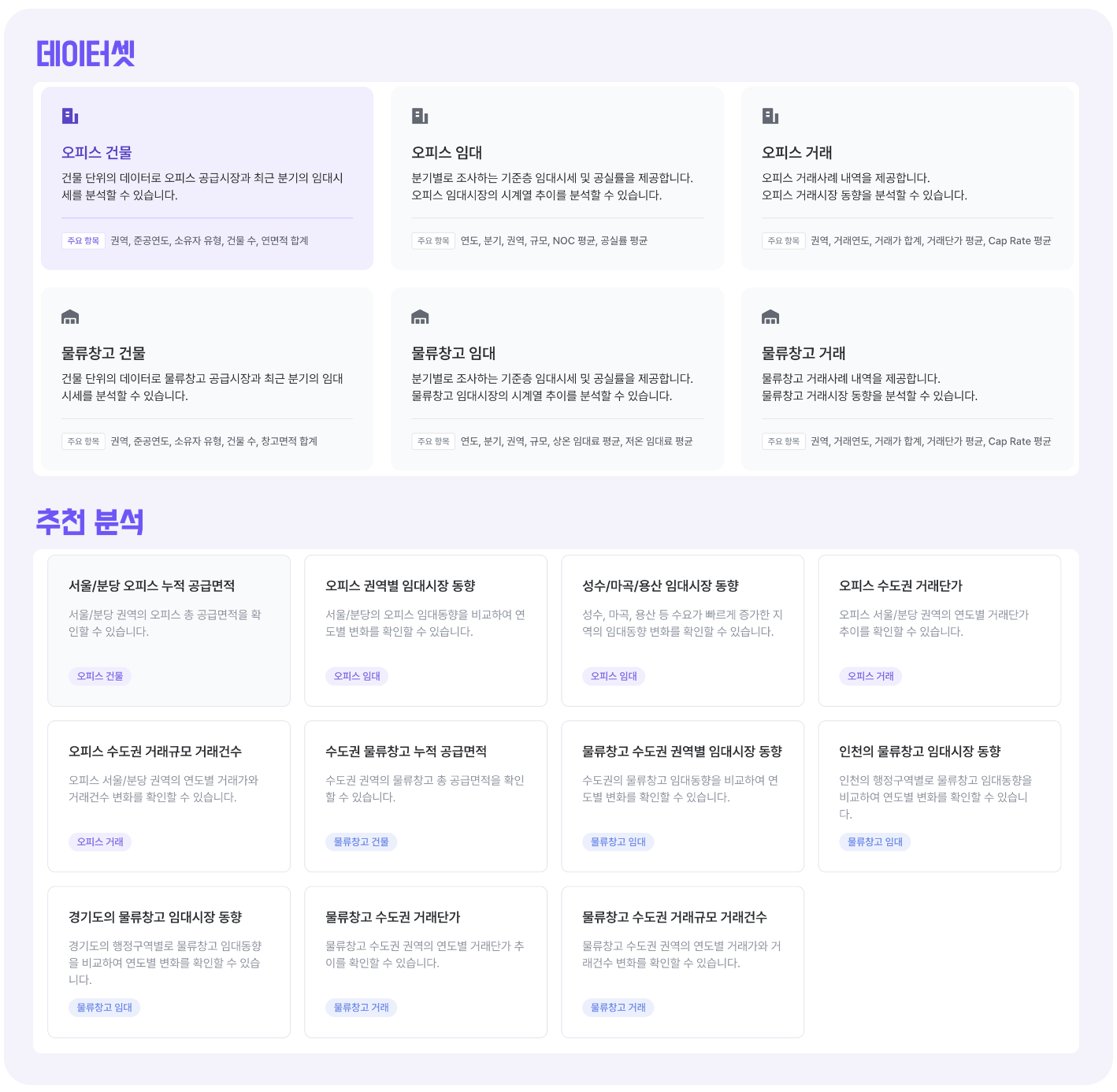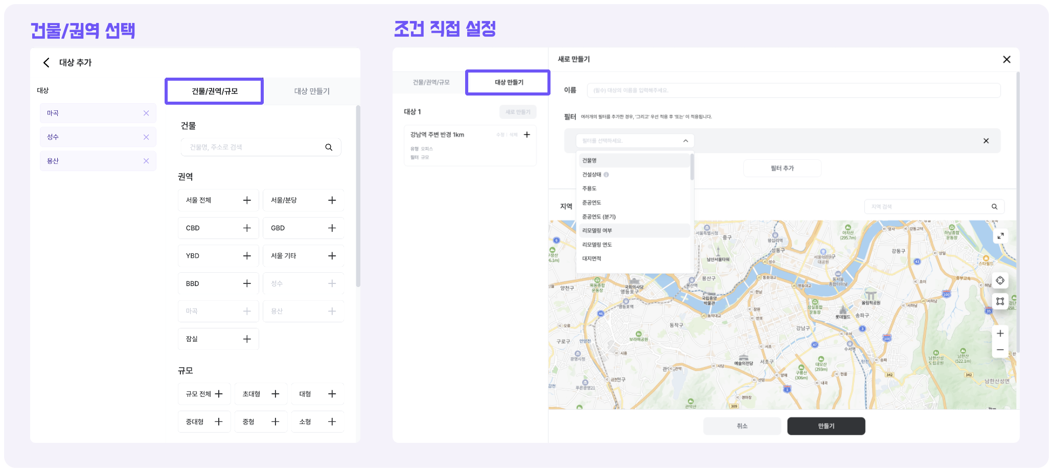 개별 건물 또는 모집단을 추가하여 비교 분석할 수 있는 기능입니다. 권역, 규모, 지역, 건물 등 분석할 대상을 선택하거나, 직접 필터나 지도를 이용해 원하는 조건으로 대상을 설정할 수 있습니다.