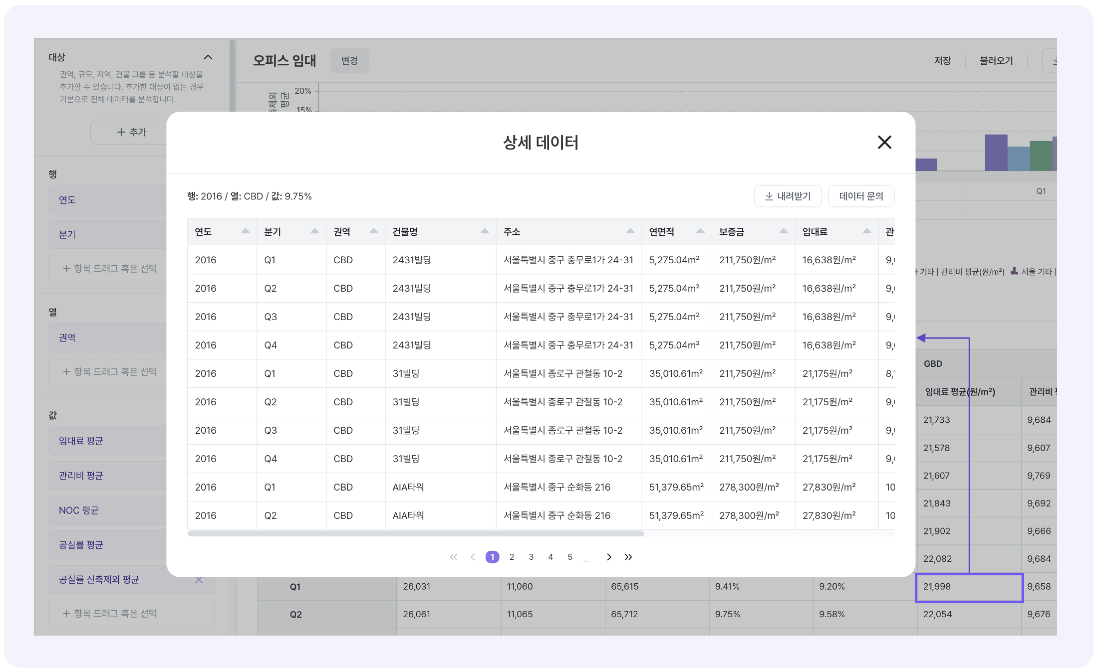 피벗 테이블에서 특정 값 항목 클릭 시, 관련 상세 데이터 조회 및 엑셀 내려받기가 가능합니다.