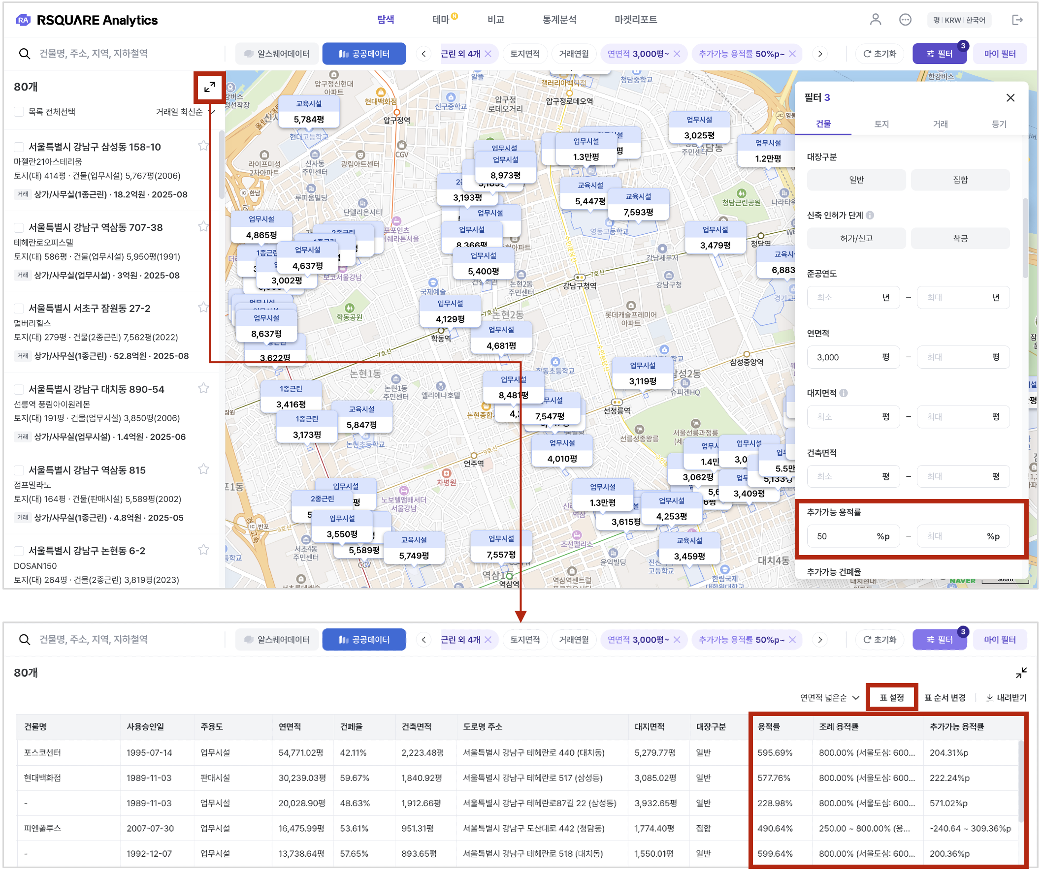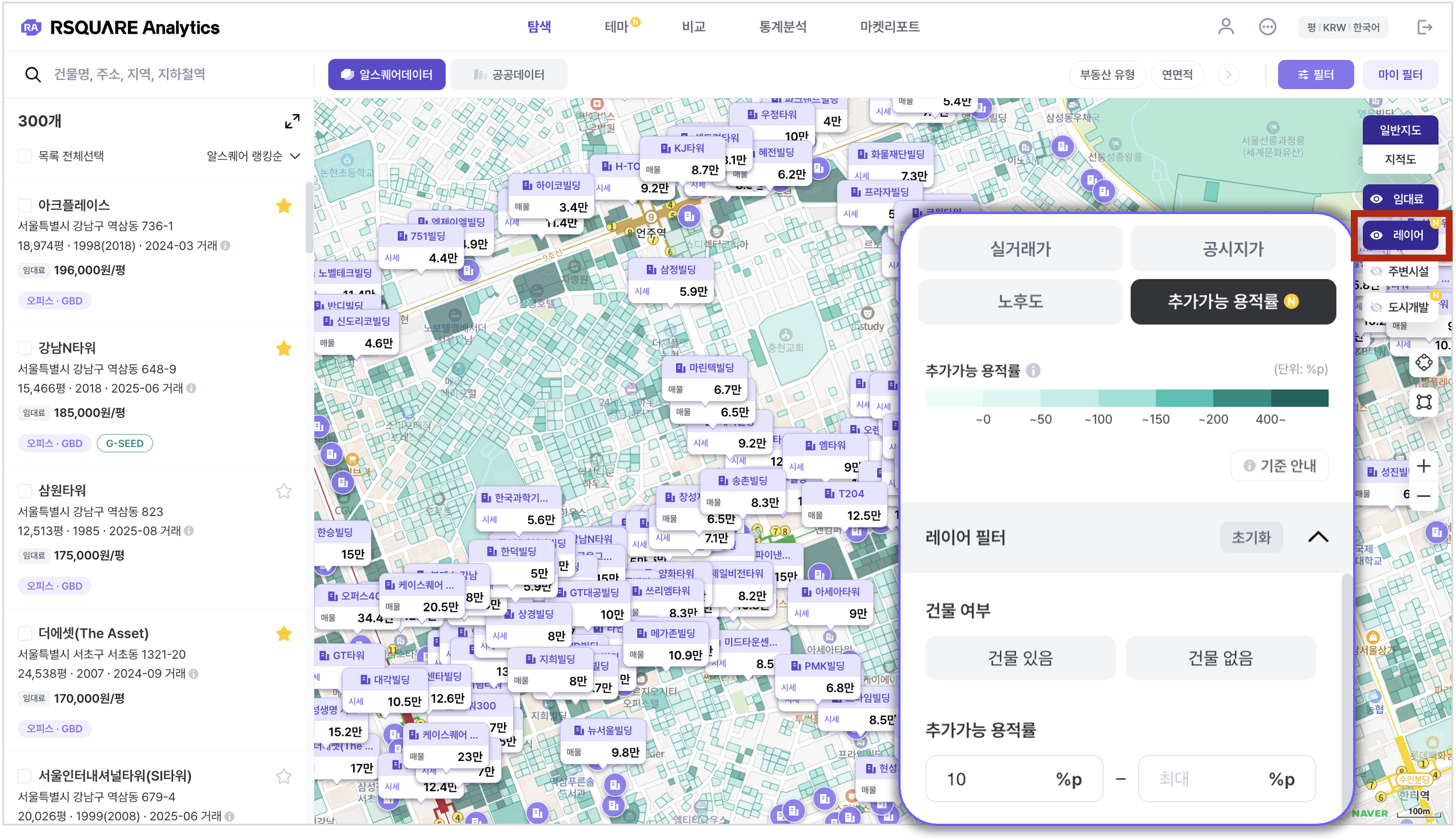 추가가능 용적률이나 연면적 조건으로 필터링 가능