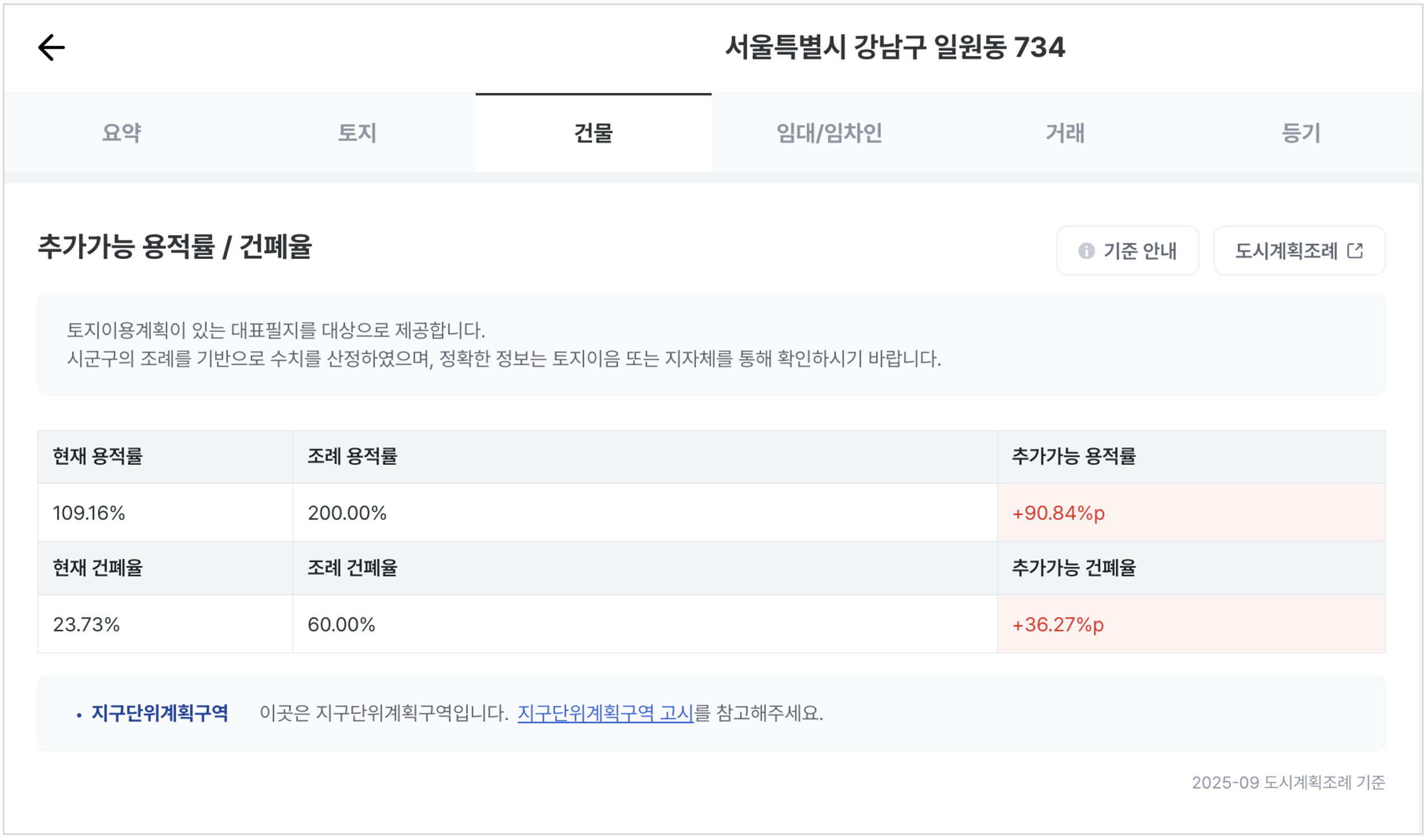 상세 화면 내 "건물" 탭에서 현재, 조례, 추가가능 각 항목별 정보 표시