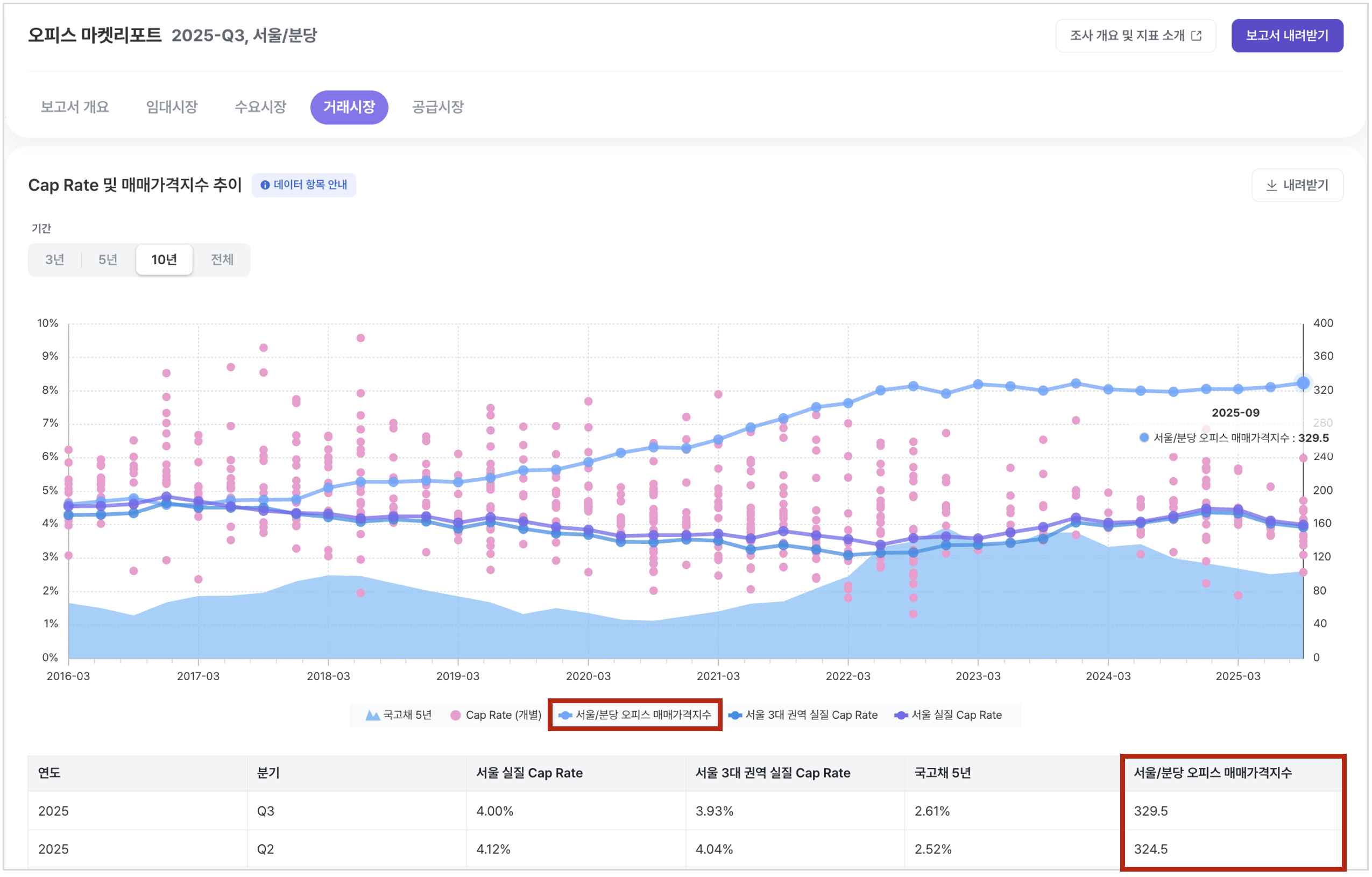기존 서울 중심의 오피스 매매가격지수 산정 기준을, 최근 분당 지역의 거래 규모 확대 및 시장 영향력 증대를 반영하여 "서울/분당" 광역 지표로 개선했습니다.