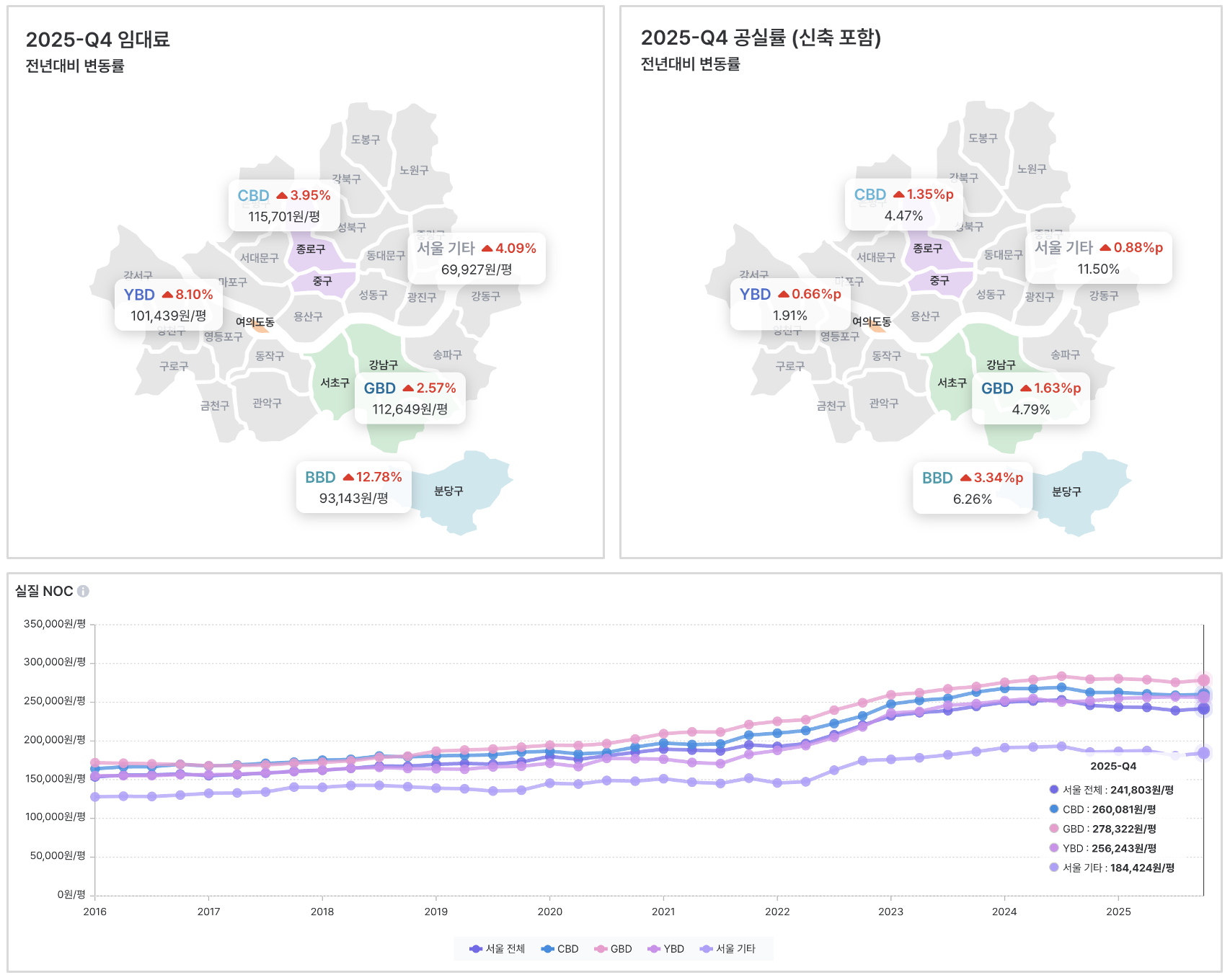기존 빌딩의 공실률 상승으로 렌트프리 제공이 확대되면서, 2025년 실질 임대료는 전반적으로 하락하였습니다.