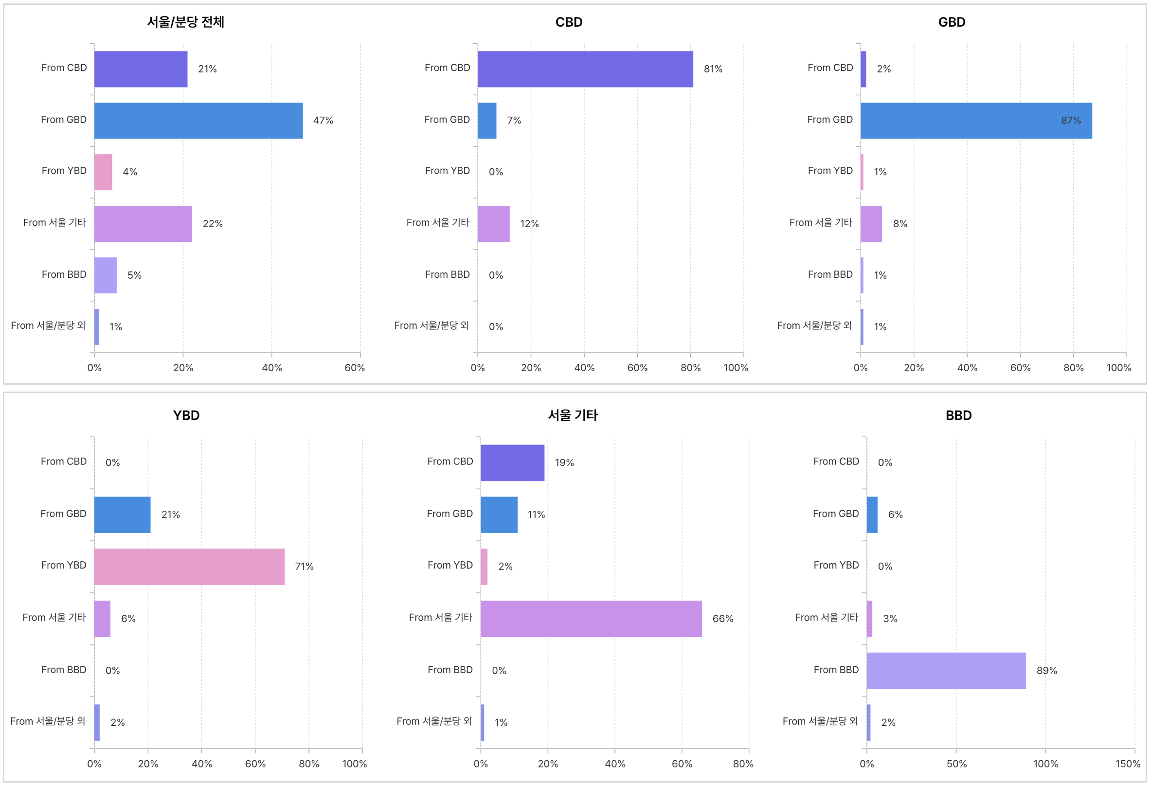 CBD와 GBD에서는 동일 권역 내에서의 임차인 이동이 두드러지게 나타났습니다.