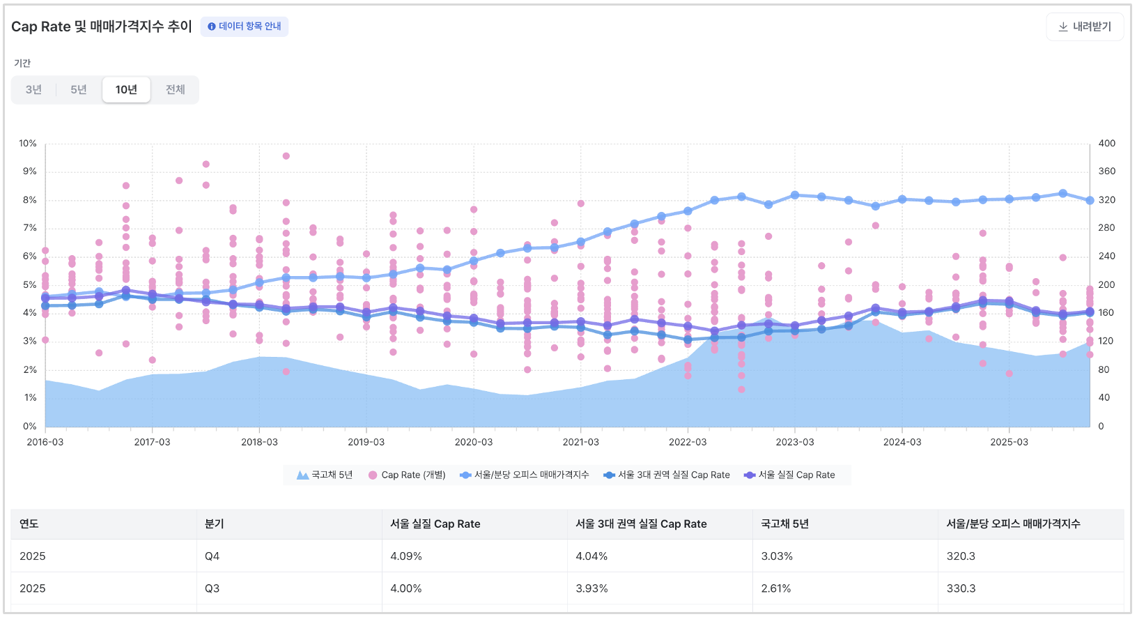 다만 2025년 4분기 이후 금리 상승으로 매매가격 조정과 Cap Rate 반등이 동시에 나타나고 있어, 2026년에는 2025년과 같은 거래시장 분위기가 이어지기 어려울 것으로 보입니다.
