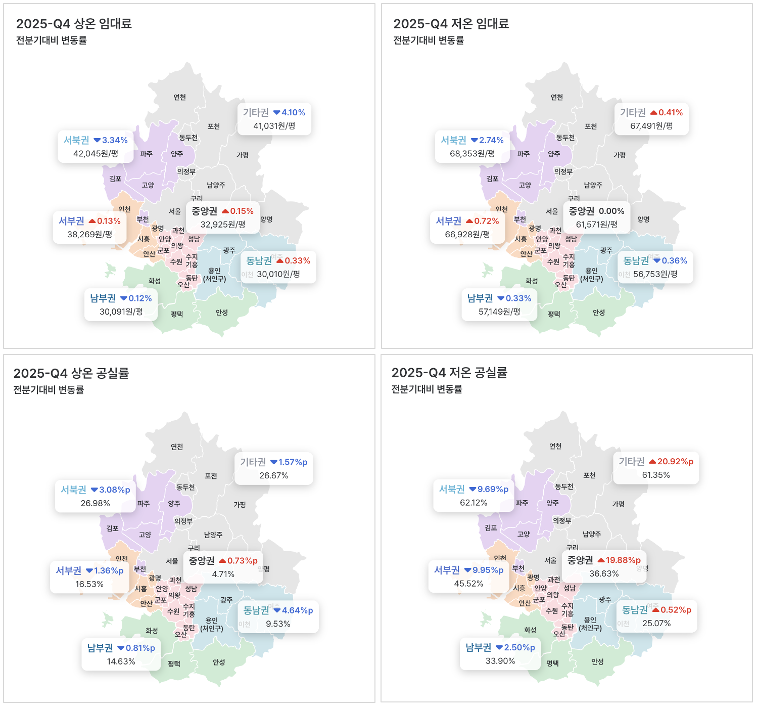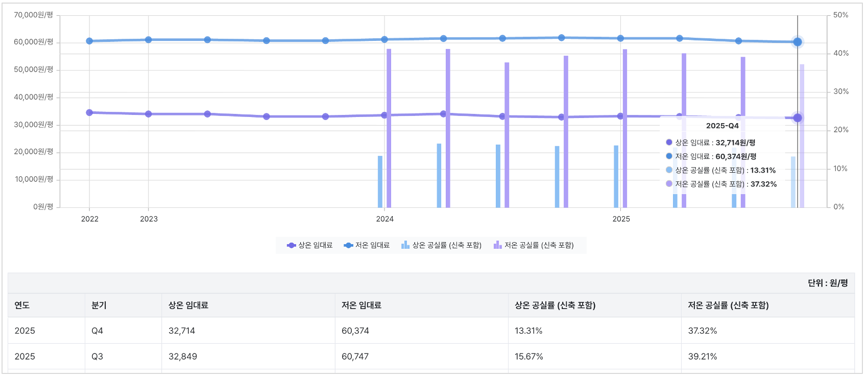 상온 공실률은 2025년 1분기 16.2%에서 4분기 13.3%로, 저온 공실률은 41.2%에서 37.4%로 하락하며, 상온과 저온 모두 유의미한 공실률 하락이 나타나고 있습니다.