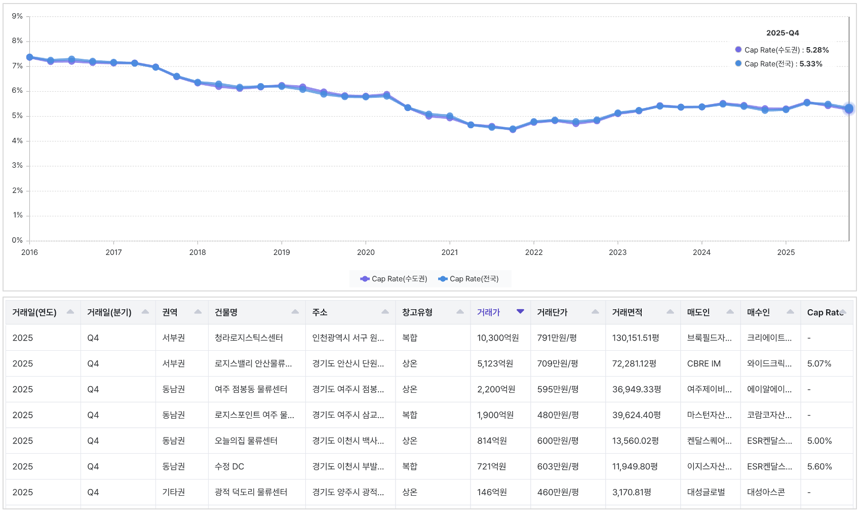 공급 과잉 영향으로 2025년 2분기까지 수도권 Cap Rate는 5.56%까지 상승하였으나, 이후 하락하여 4분기에는 5.28%를 기록하였습니다.